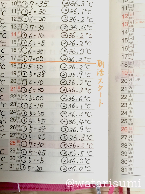 『朝活手帳』の推奨する4時起き生活にはまだまだ遠いですが、今までよりは確実に早起きできるようになってる!と手ごたえを感じています(*^^*)